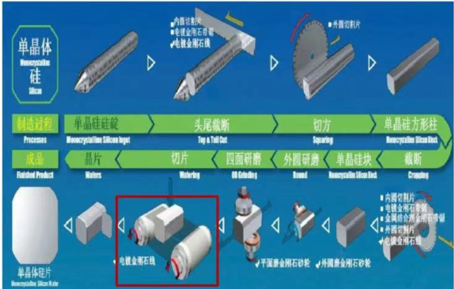 絲杠-也可應用在切片機上,絲杠驅動壓裝機構壓緊硅晶,硅晶下端由旋轉的金剛線對硅晶進行切割,可取代傳統的砂漿切片。